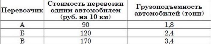 Для транспортировки 3 тонн груза на 350 км можно воспользоваться услугами из трёх фирм-перевозчиков. Стоимость перевозки и грузоподъёмность автомобилей для каждого перевозчика указана в таблице. Сколько рублей придётся заплатить за самую дешёвую перевозку?