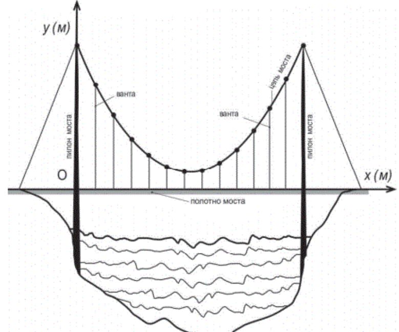 На рисунке изображена схема одного вантового моста. Введем систему координат: ось Оу направим вертикально вдоль одного из пилонов, а ось Ox направим вдоль полотна моста, как показано на рисунке. В этой системе координат линия, по которой провисает цепь моста, имеет уравнение: