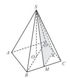 В правильной четырёхугольной пирамиде SABCD высота SO равна 13, диагональ основания BD равна 8. Точки K и M — середины ребер CD и BC соответственно. Найдите тангенс угла между плоскостью SMK и плоскостью основания ABC.