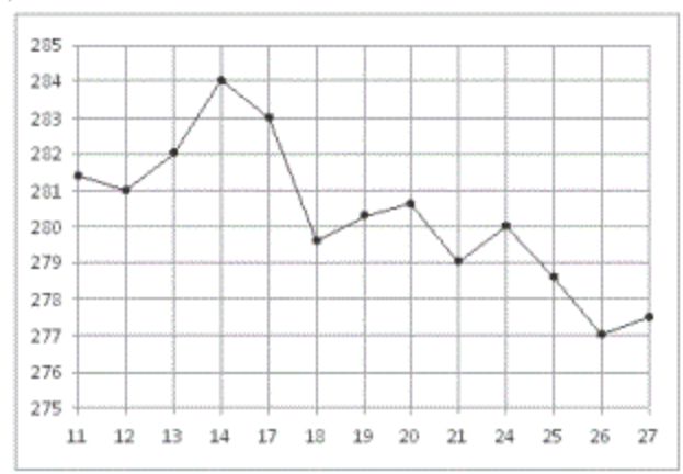 На рисунке жирными точками показана цена золота на момент закрытия биржевых торгов во все рабочие дни с 11 по 27 июля 2000 года. По горизонтали указываются числа месяца, по вертикали — цена унции золота в долларах США. Для наглядности жирные точки на рисунке соединены линией. Определите по рисунку разность между наибольшей и наименьшей ценой золота на момент закрытия торгов в указанный период (в долларах США за унцию).