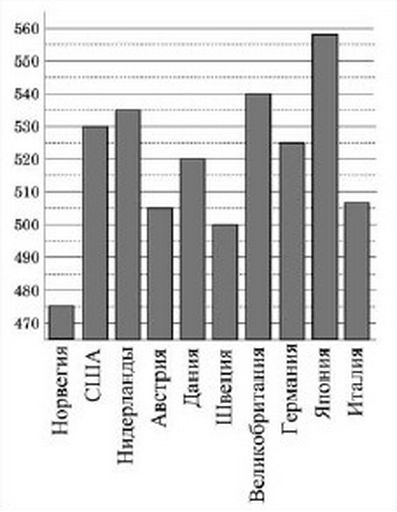 На диаграмме показан средний балл участников из 10 стран в тестировании учащихся 8-го класса по естествознанию в 2007 году (по 1000-балльной шкале). Среди указанных стран первое место принадлежит Японии. Определите, какое место занимает Словения.
