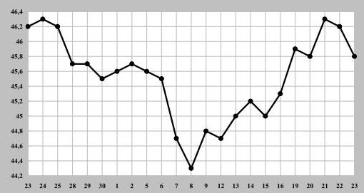 На рисунке жирными точками показан курс евро, установленный Центробанком РФ, во все рабочие дни с 22 ноября по 22 декабря 2012 года. По горизонтали указываются числа месяца, по вертикали — цена евро в рублях. Для наглядности жирные точки на рисунке соединены линией. Определите по рисунку, какого числа курс евро был наименьший за указанный период.
