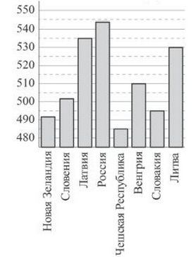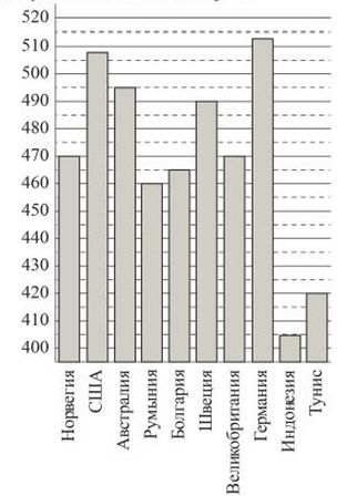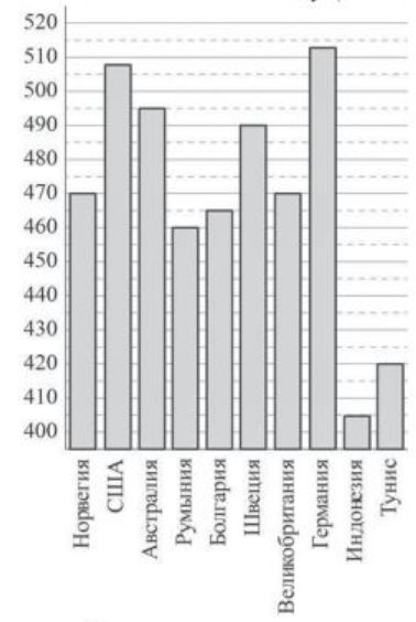 На диаграмме показан средний балл участников 10 стран в тестировании учащихся 8-го класса по математике в 2007 году (по 1000-бальной шкале). Найдите средний балл участников из Болгарии.