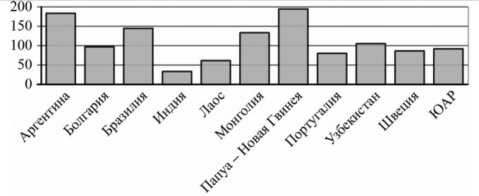 На диаграмме показано распределение выплавки меди в 11 странах мира ( в тысячах тонн) за 2006 год. Среди представленных стран первое место по выплавке меди занимает Папуа — Нова Гвинея, одиннадцатое место — Индия. Какое место занимала Аргентина?