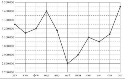 На рисунке точками показана аудитория поискового сайта Ya.ru во все месяцы с декабря 2008 по октябрь 2009 года. По горизонтали указываются месяцы, по вертикали — количество посетителей сайта хотя бы раз в данном месяце. Для наглядности точки на графике соединены линией. Определите по рисунку разность между наибольшей и наименьшей аудиторией сайта Ya.ru в указанный период.