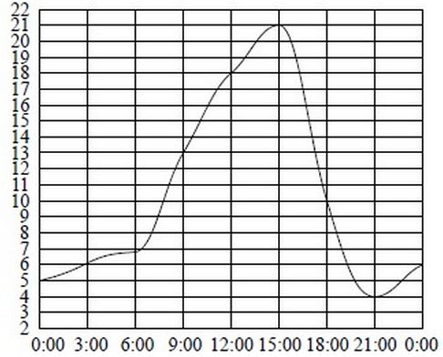 На рисунке показано, как изменялась температура воздуха на протяжении одних суток. По горизонтали указано время суток, по вертикали - значение температуры в градусах Цельсия. Найдите разность между наибольшим значением температуры и наименьшим.