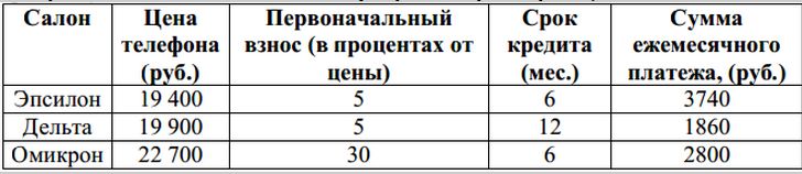 В трёх салонах сотовой связи один и тот же телефон продаётся в кредит на разных условиях. Условия даны в таблице.