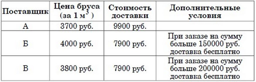 Строительной фирме нужно приобрести 40 кубометров строительного бруса у одного из трех поставщиков. Какова наименьшая стоимость покупки с доставкой (в рублях)? Цены и условия доставки приведены в таблице.