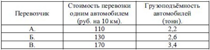 Для транспортировки 3 тонн груза на 250 км можно воспользоваться услугами одной из трёх фирм-перевозчиков. Стоимость перевозки и грузоподъёмность автомобилей для каждого перевозчика указана в таблице. Сколько рублей придётся заплатить за самую дешёвую перевозку?