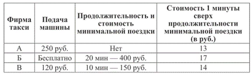 В таблице даны тарифы на услуги трех фирм такси. Предполагается поездка длительностью 30 минут. Нужно выбрать фирму, в которой заказ будет стоить дешевле всего. Сколько рублей будет стоить этот заказ?