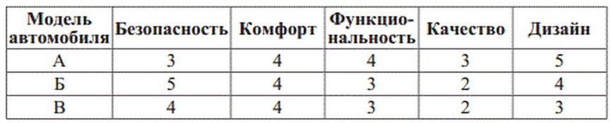 где S - безопасность, С - комфорт, F - функциональность, Q - качество, D - дизайн. В таблице даны оценки каждого показателя для трех моделей автомобилей по результатам опроса читателей журнала. Определите, какой автомобиль имеет наименьший рейтинг. В ответ запишите значение этого рейтинга.