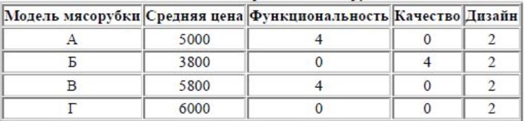 В таблице даны средняя цена и оценки каждого показателя для нескольких моделей электрических мясорубок. Определите наибольший рейтинг представленных в таблице моделей электрических мясорубок.