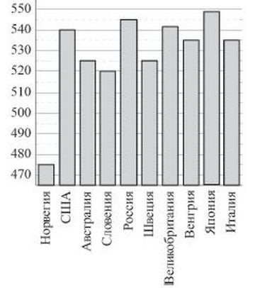 На диаграмме показан средний балл участников из 10 стран в тестировании учащихся 8-го класса по естествознанию в 2007 году (по 1000-балльной шкале). Среди указанных стран первое место принадлежит Японии. Определите, какое место занимает Словения.