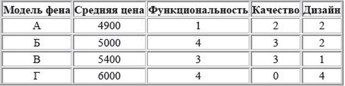 Рейтинговое агенство определяет рейтинг соотношения "цена-качество" электрических фенов для волос. Рейтинг вычисляется на основе средней цены P, а также оценок функциональности F, качества Q и дизайна D, которые эксперты оценивают целыми числами от до