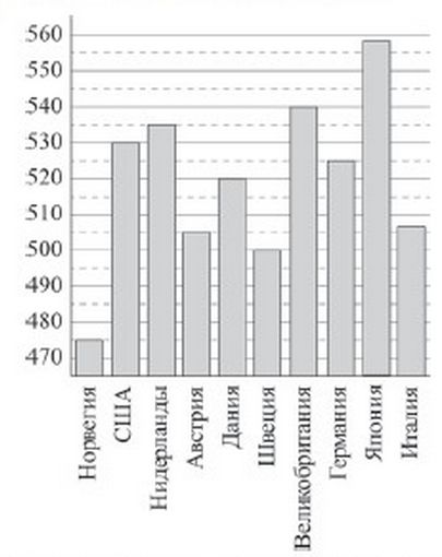 На диаграмме показан средний балл участников 10 стран в тестировании учащихся 4-класса по математике в 2007 году (по 1000-бальной шкале). По данным диаграммы найдите число стран, в которых средний балл, не выше, чем 520.