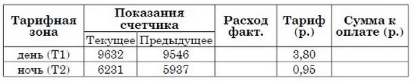 Платеж за потребление электроэнергии осуществляется по двухтарифному счетчику. Тариф зависит от времени суток. Общая сумма платежа складывается из сумм по каждому из двух тарифов. Квитанция на оплату содержит следующую таблицу.